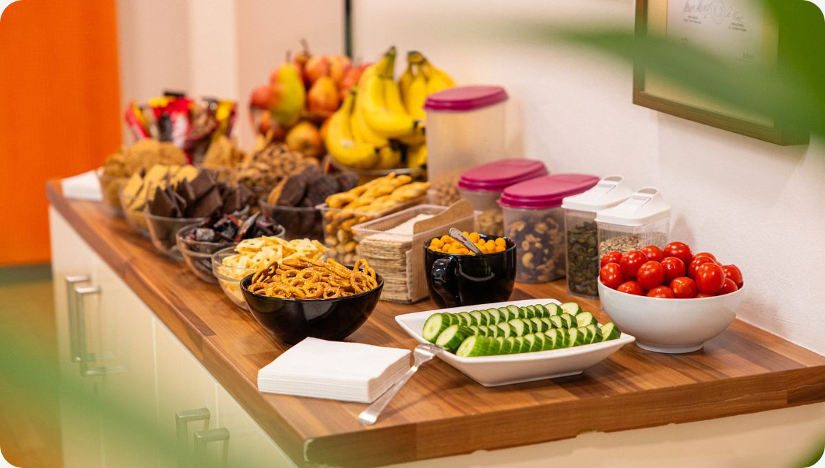 Pausenraum mit Snack-Theke Kühlschrank, Mikrowelle, Kaffee-Vollautomat, Geschirr/Besteck