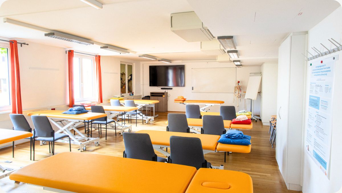 diverse Bestuhlung möglich: Therapieliegen mit Stühlen, Blockform, Kinobestuhlung, U-Form, Klassenzimmer, Gymnastikmatten